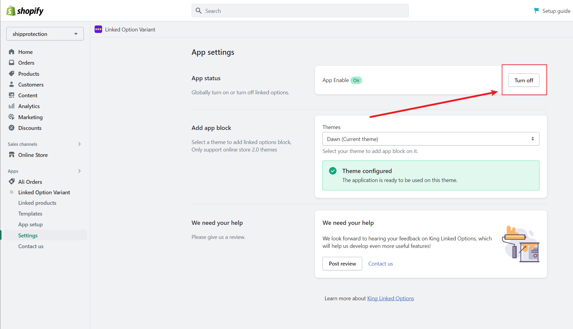 First, navigate to “Settings” menu, “Apps > King Linked Options > Settings”, and click the “Turn off” button.