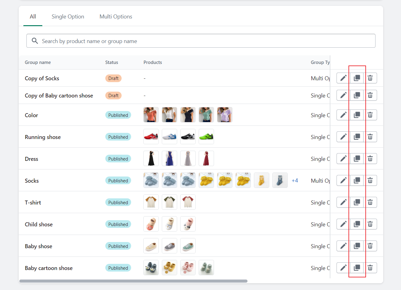 3. Click the "**Duplicate**" button next to the group you want to copy.